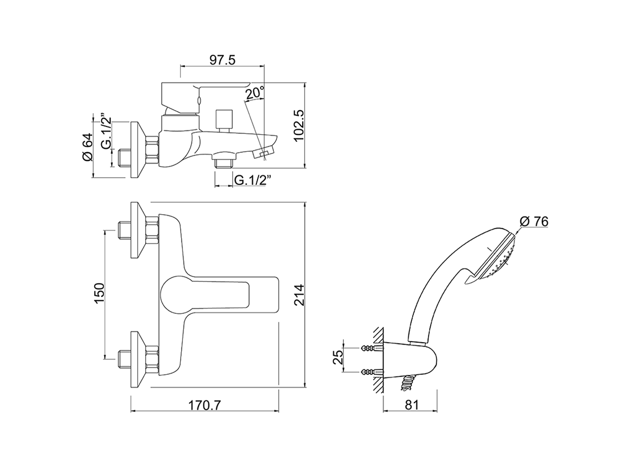Bañera monomando con duplex,soporte duchita articulado mural,duchita Teti 3 funciones de ABS,flexible de Latón 150 cm