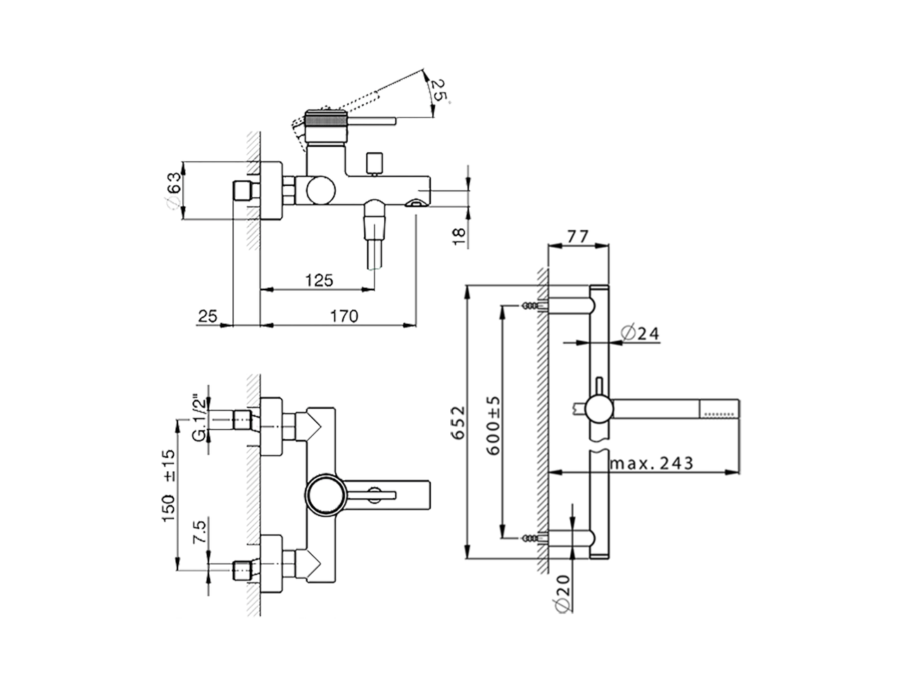 Bañera monomando con duplex,barra 60 cm con soporte corredizo,duchita una función minimal Ø24mm de Latón,flexible lisse SUPREME 150 cm