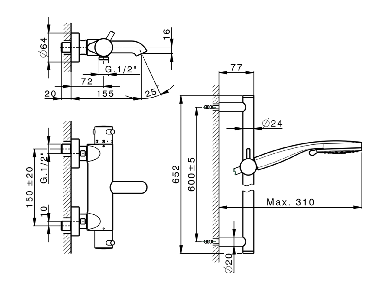 Bañera termostática con barra-corrediza,barra 60 cm con soporte corredero,duchita 3 funciones Ø 100 mm de ABS,flexible liso SUPREME 150 cm