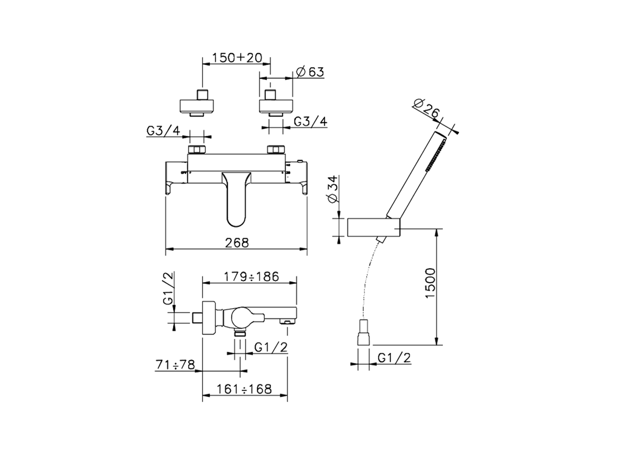Bañera termostática con duplex,soporte duchita articulado mural,duchita una función minimalista Ø 26 mm de ABS,flexible de Latón 150 cm
