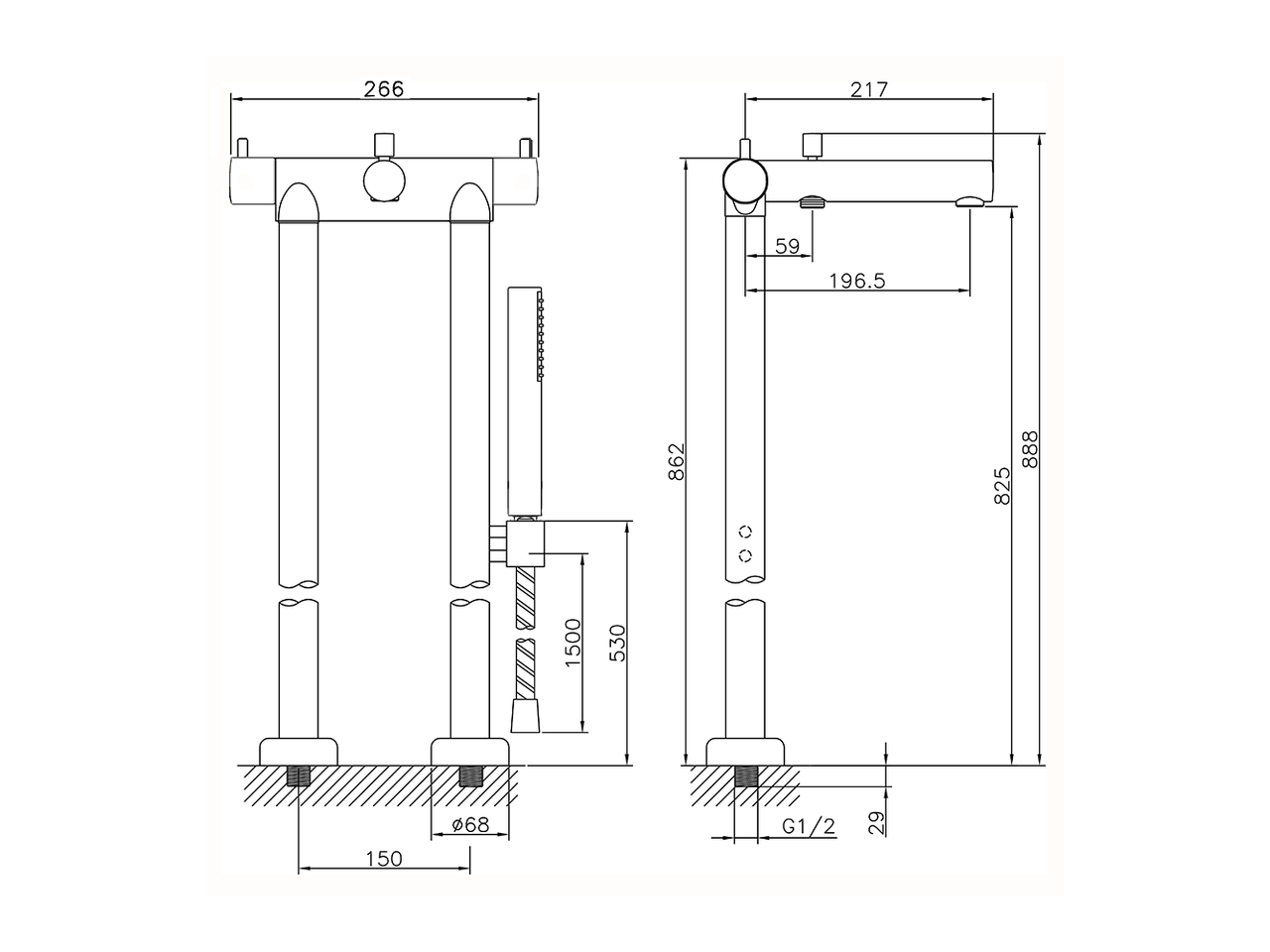Bañera termostática de suelo,soporte duchita sobre columna,duchita una función minimalista Ø 26 mm de ABS,flexible de Latón 150 cm