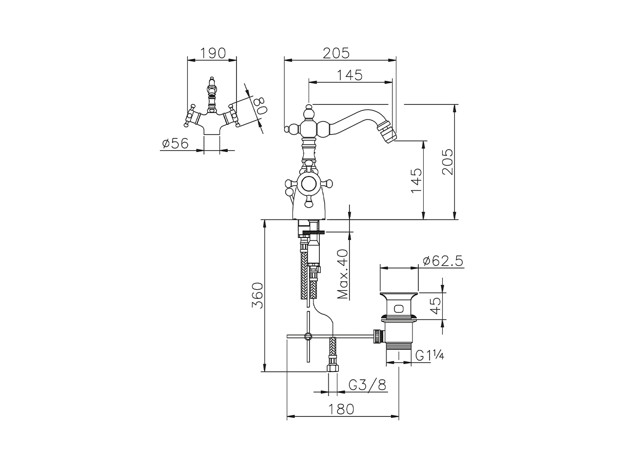 Bidé termostático,con desagüe automático 1"1/4,caño giratorio,latiguillos acero G.3/8"