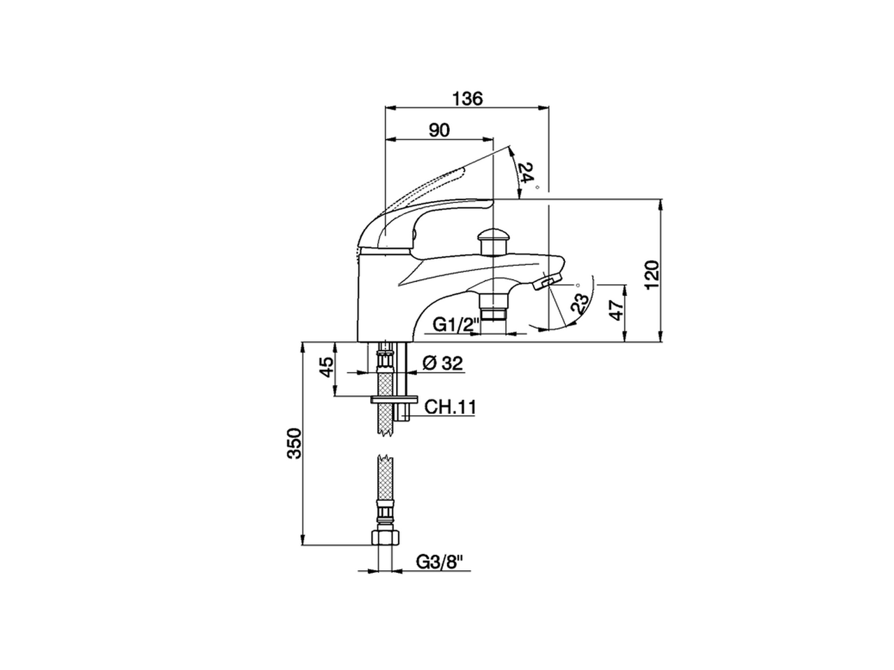 Borde Bañera monomando,sin conjunto ducha,conexión para latiguillo 1/2"M,latiguillos acero G.3/8"