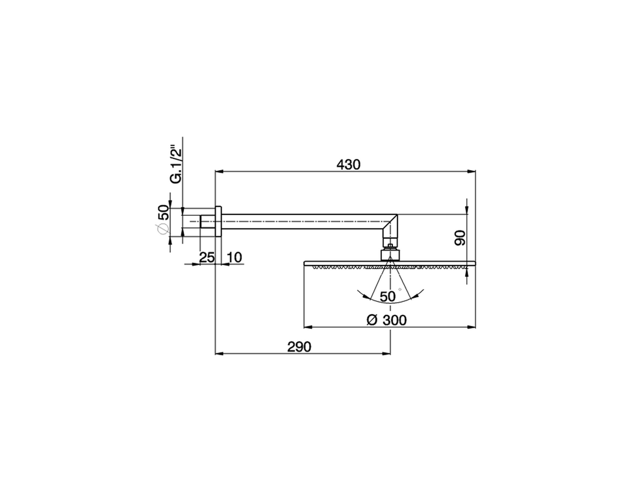 Brazo ducha con rociador,rociador redondo Ø 300 mm espesor 7 mm de Latón,brazo ducha L.290 mm