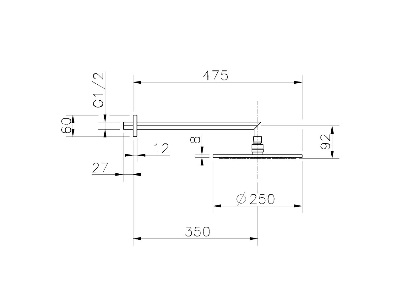 Brazo ducha con rociador,rociador redondo Ø 250 mm es.8 mm de LATÓN,brazo ducha L.350 mm