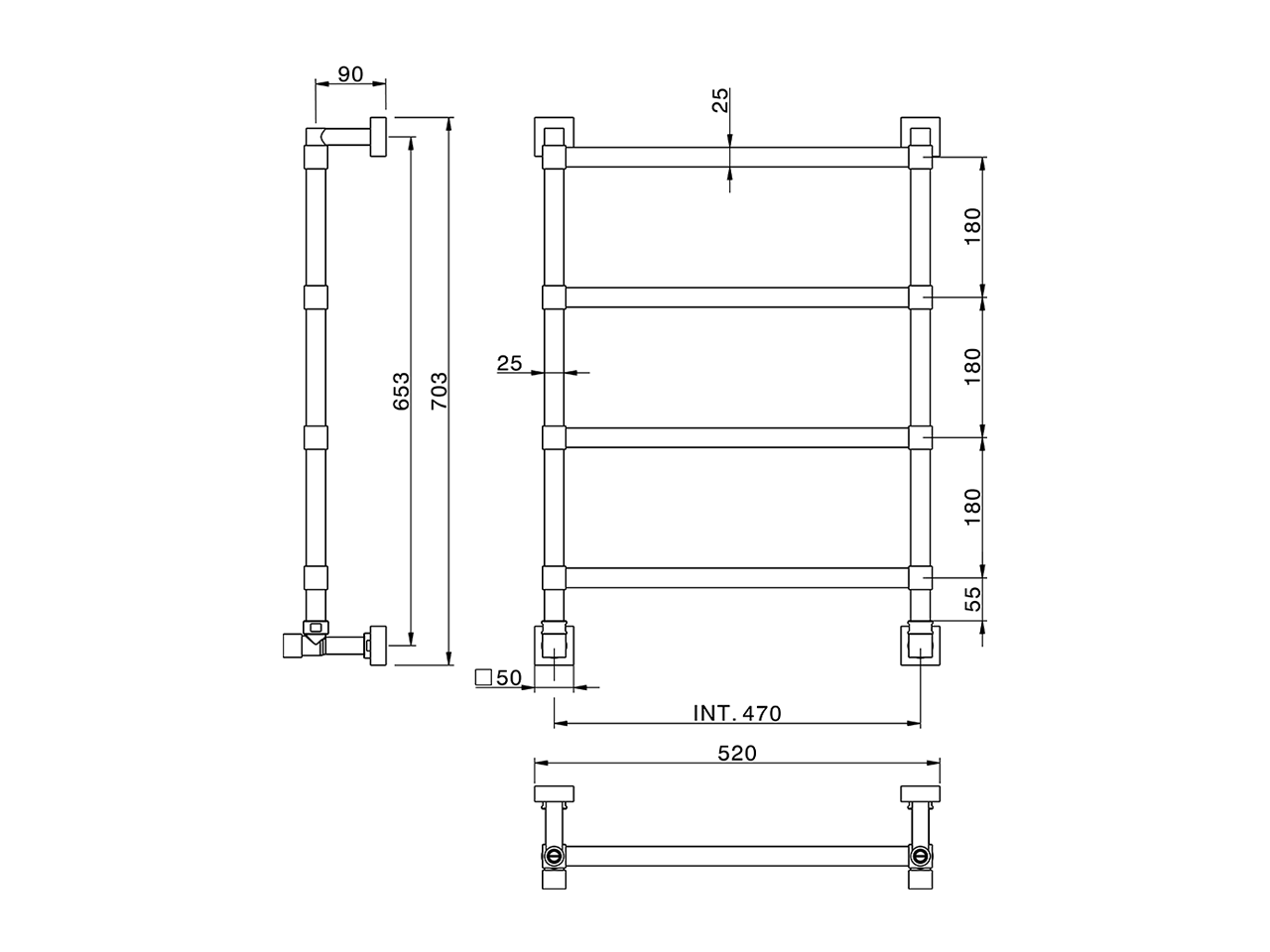 Calienta toallas fijo componible Ø25 mm,con detalles cuadrados 30x30mm,conexión 1/2 con excéntrico,Instalación hidráulica,Latón