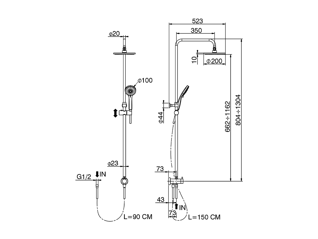 Columna ducha con desviador,desviador 2 salidas con toma de agua externa,columna telescópica,soporte duchita corredizo,duchita 3 funciones Ø 100 mm ABS,rociador redondo Ø200 mm espesor 11,5 mm de ABS,flexible de acero inoxidable doble 90-150 cm