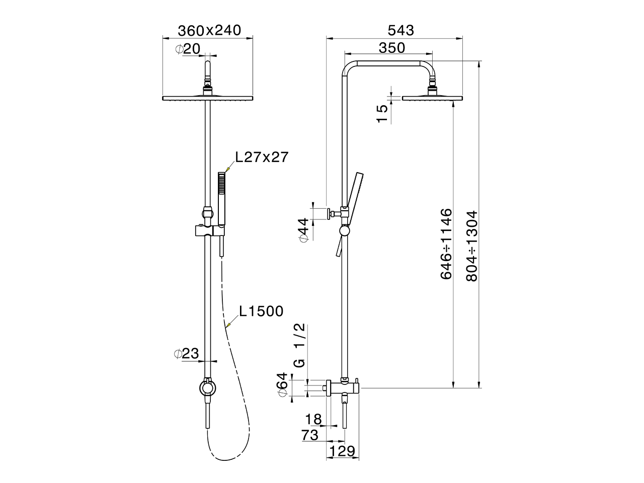cuadrada 27x27mm ABS,rociador rectangular 240x360x15 mm,flexible liso SILVERFLEX 150 cm