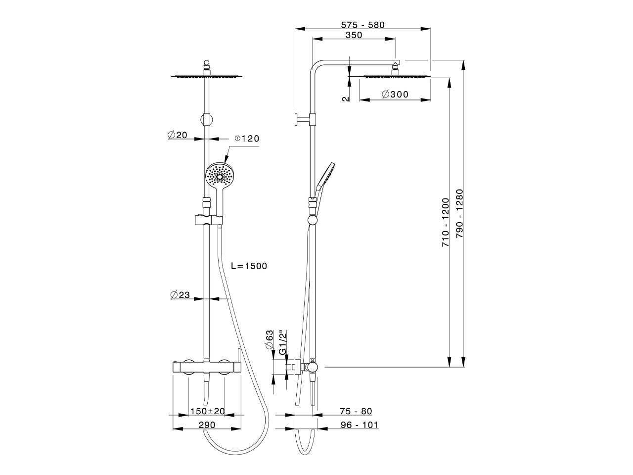 Columna monomando ducha 2 funciones,deviastop 2 salidas,columna telescópica,soporte duchita corredero,duchita 3 funciones Ø 120 mm de ABS,rociador redondo Ø 300 mm es.2 mm de INOX,flexible liso SILVERFLEX 150 cm
