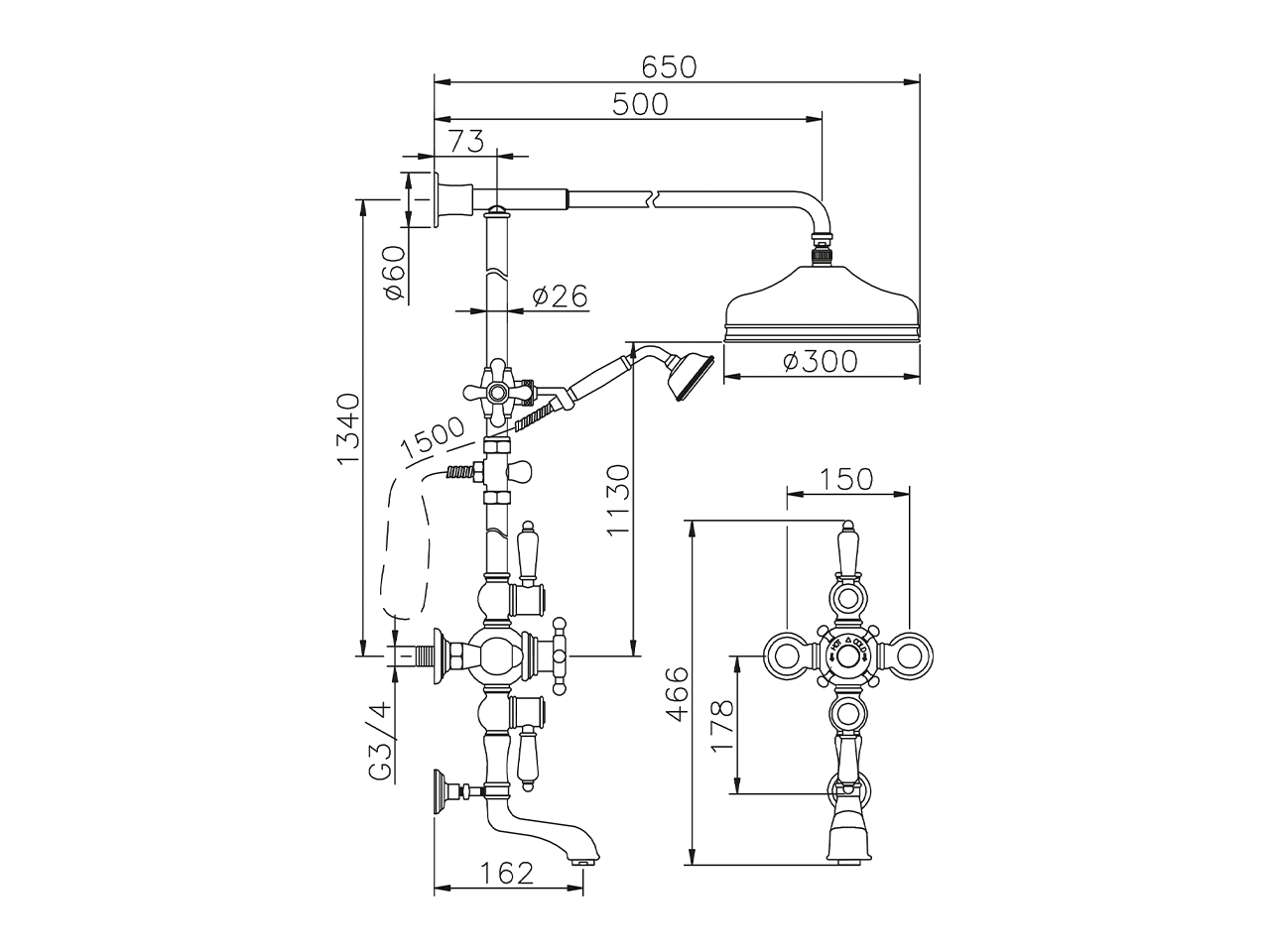Columna termostática bañera 3 funciones,desviador 2 salidas,columna fija,2 llaves de paso,soporte duchita corredero,duchita una posición Clásica Ø 78 mm de Latón,rociador redondo Ø 300 mm de Latón,flexible de Latón 150 cm