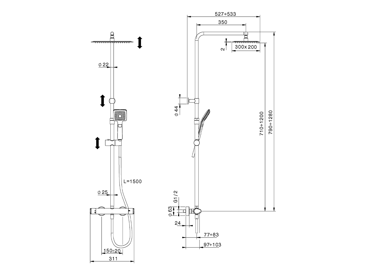 Columna termostática ducha 2 funciones,deviastop 2 salidas,columna telescópica,soporte duchita corredizo,duchita 3 funciones Ø 96x96 mm de ABS,rociador rectangular 300x200x2 mm de Inox,flexible liso SUPREME 150 cm