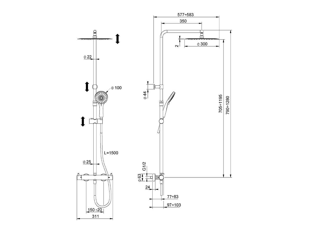 Columna termostática ducha 2 funciones,deviastop 2 salidas,columna telescópica,soporte duchita corredizo,duchita 3 funciones Ø 100 mm de ABS,rociador redondo Ø 300 mm es.2 mm de INOX,flexible liso SILVERFLEX 150 cm