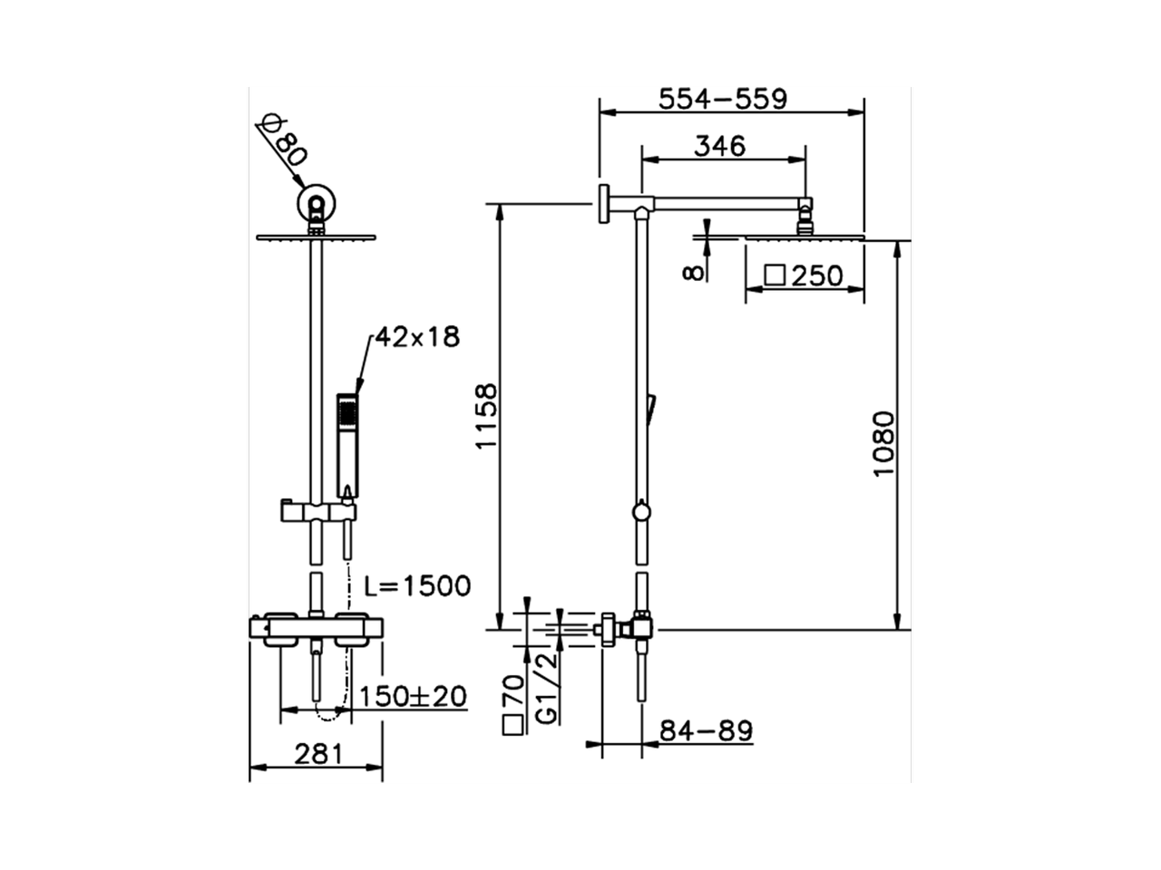Columna termostática ducha 2 funciones,deviastop 2 salidas,columna fija,soporte duchita corredizo,duchita una función Quad 42x18 mm de ABS,rociador cuadrado 250x250 mm de LATÓN,flexible liso SILVERFLEX 150 cm