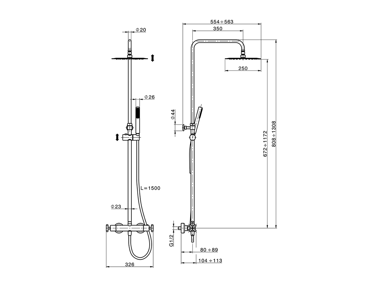 Columna termostática ducha 2 funciones,deviastop 2 salidas,columna telescópica,soporte duchita corredero,duchita una función minimalista Ø 26 mm de ABS,rociador redondo Ø 250 mm de INOX,flexible liso SUPREME 150 cm