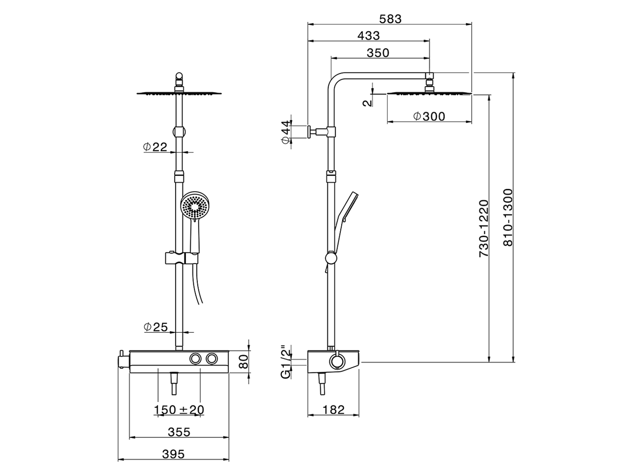 Columna termostática ducha 2 funciones,deviastop 2 salidas con botones,columna telescópica,soporte duchita corredizo,duchita 3 funciones Lodge Ø100 mm de ABS,rociador redondo Ø 300 mm es.2 mm de INOX,flexible liso SILVERFLEX 150 cm