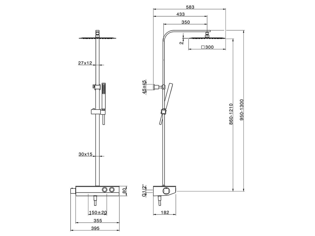 cuadrada 27x27mm ABS,rociador cuadrado 300x300 mm es.2 mm de INOX,flexible liso SILVERFLEX 150 cm