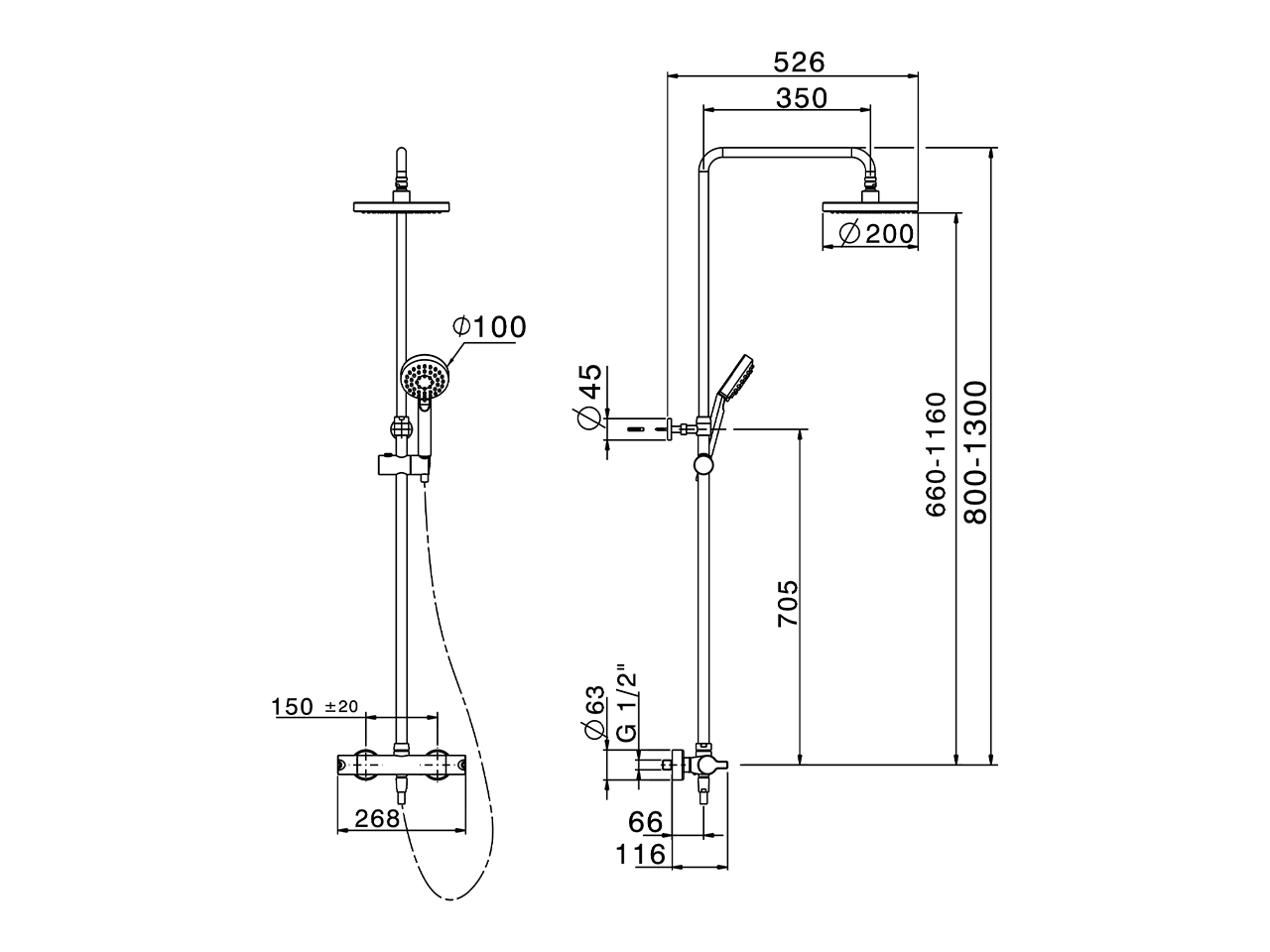 Columna termostática ducha 2 funciones,deviastop 2 salidas,columna telescópica,soporte duchita corredero,duchita 5 funciones Ø 100 mm de ABS,rociador redondo Ø 200 mm de ABS,flexible de latón 150 cm