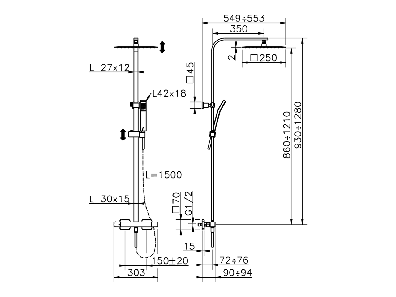 Columna termostática ducha 2 funciones,deviastop 2 salidas,columna telescópica,soporte duchita corredizo,duchita una función Quad 42x18 mm de ABS,rociador cuadrado 250x250 mm es.2 mm de INOX,flexible liso SILVERFLEX 150 cm