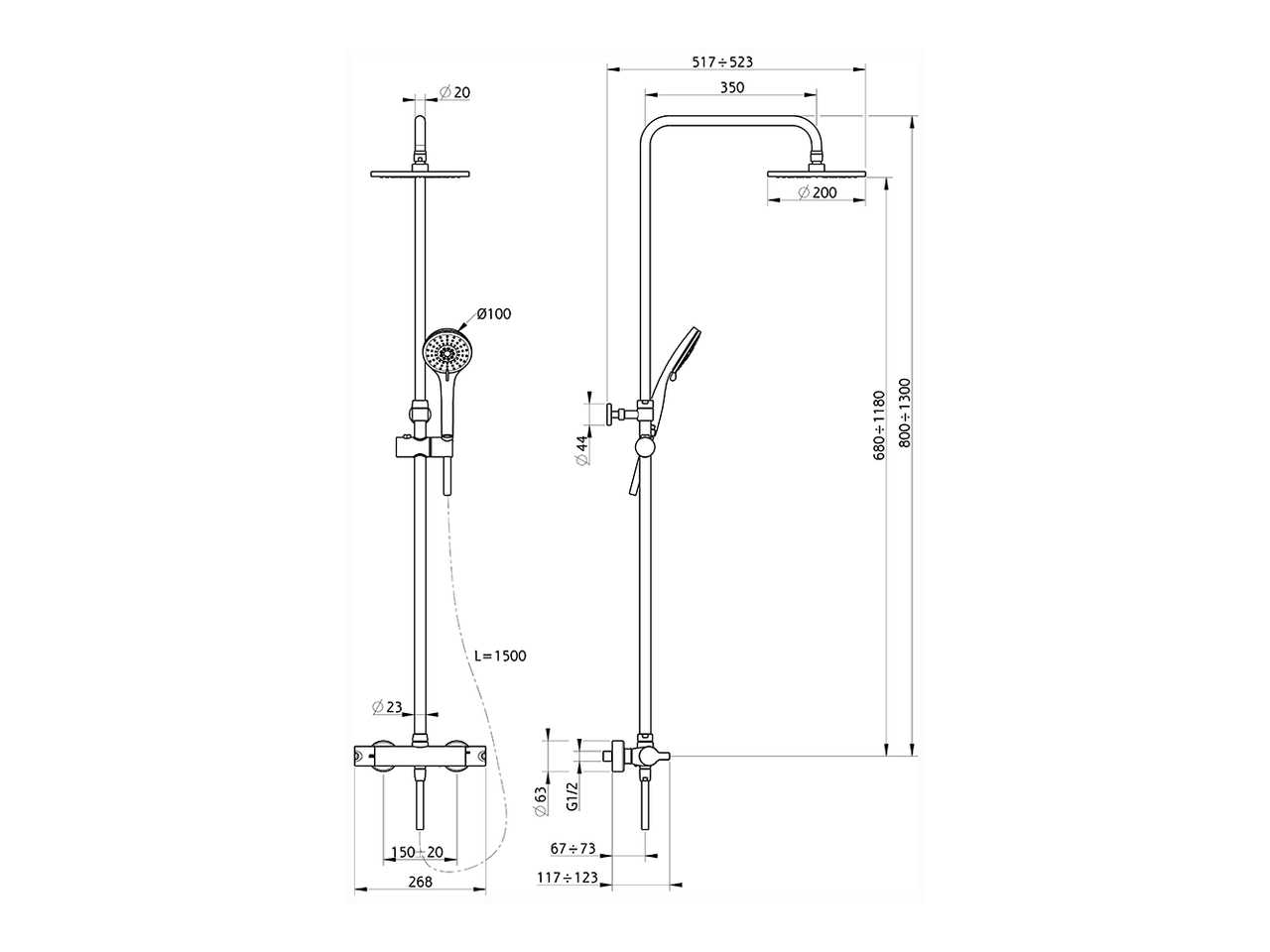 Columna termostática ducha 2 funciones,deviastop 2 salidas,columna telescópica,soporte duchita corredizo,duchita 3 funciones Ø 100 mm de ABS,rociador redondo Ø 200 mm es.8 mm de LATÓN,flexible liso SILVERFLEX 150 cm