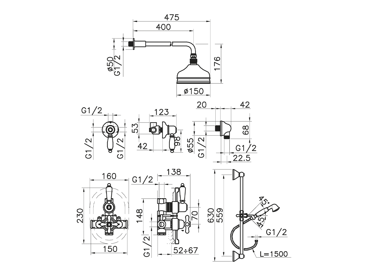 Conjunto ducha termostático empotrado,mezclador termostático empotrado 1/2",llave de paso con salida 1/2",desviador 2 salidas,barra 56 cm con soporte corredero,brazo ducha con rociador L.400 mm,rociador redondo Ø 150 mm de Latón,duchita una función clásica Ø 53 mm de Latón,toma de agua 1/2",flexible de Latón 150 cm