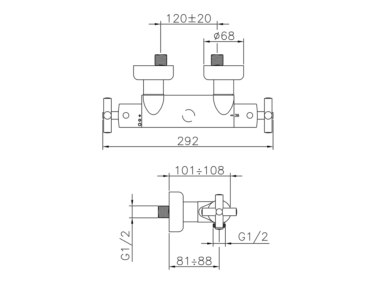 Ducha termostática,sin conjunto ducha,entre-ejes 120 mm,conexión para flexible 1/2" M