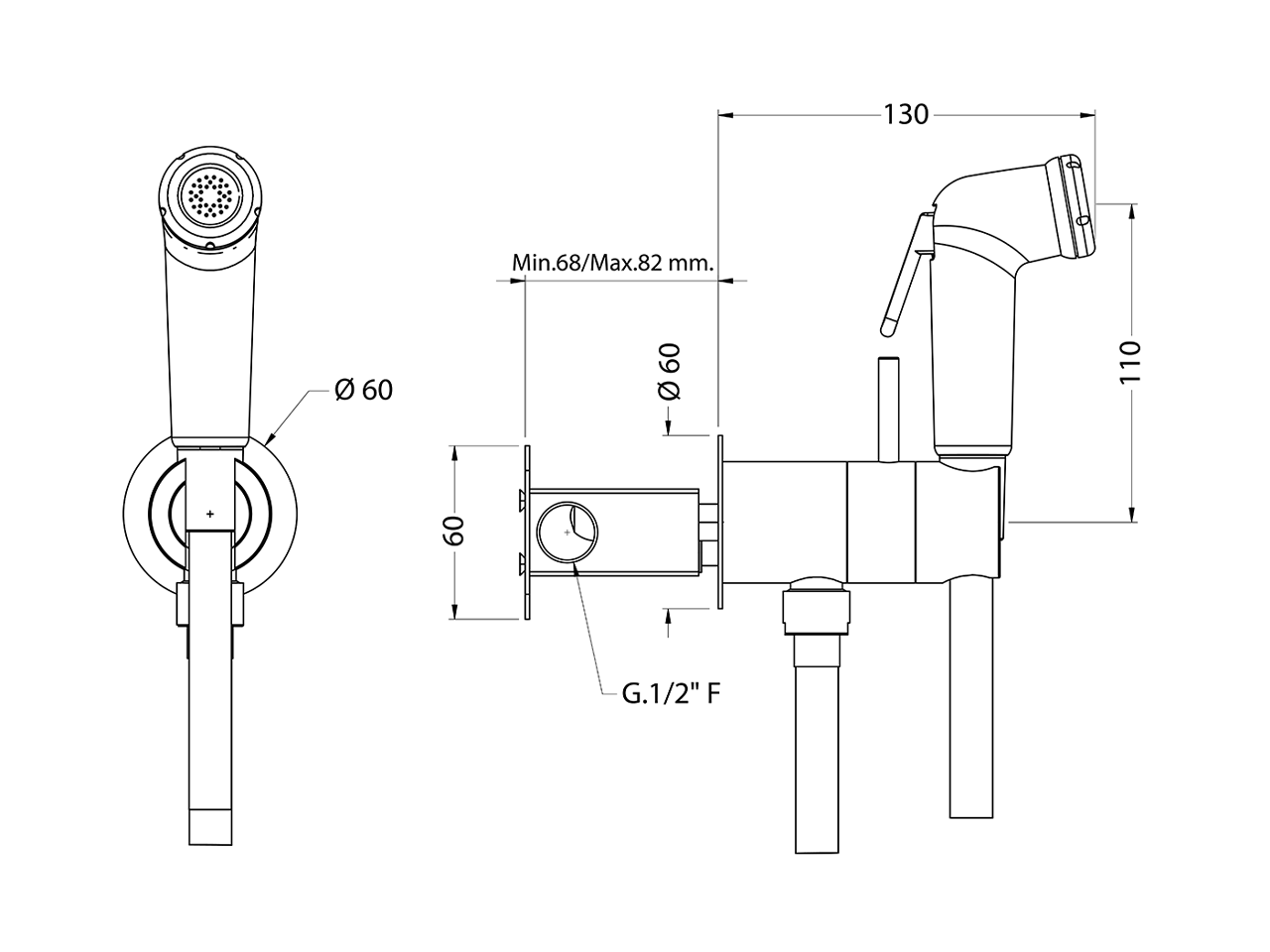 Kit ducha higiénica para bidé,soporte mural redondo,mezclado progresivo agua caliente-fría,comprensivo de parte empotrada,Ducha higiénica de ABS - flexible PVC 120 cm