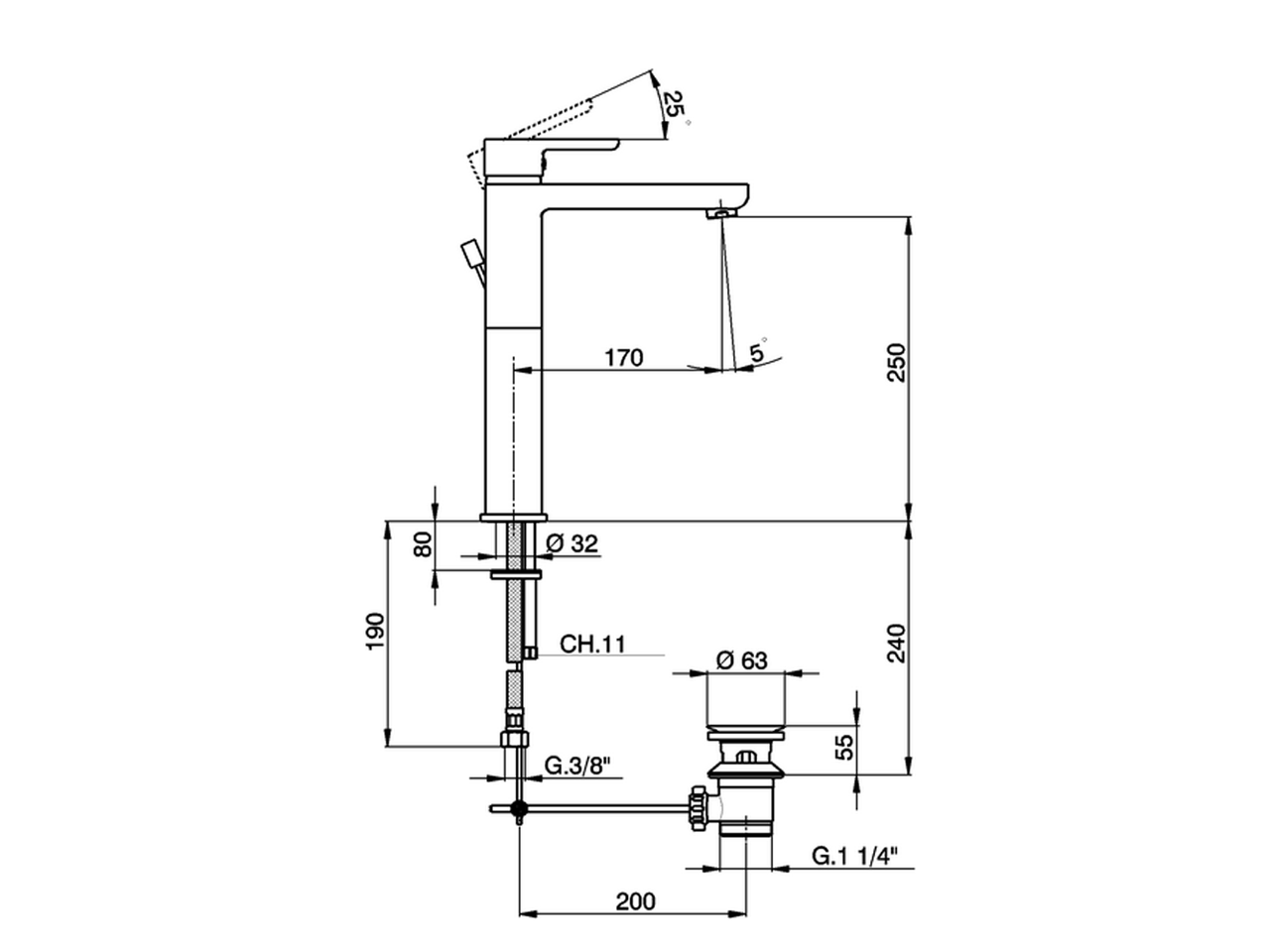 Lavabo monomando alto,con desagüe automático 1"1/4,latiguillos acero G.3/8"