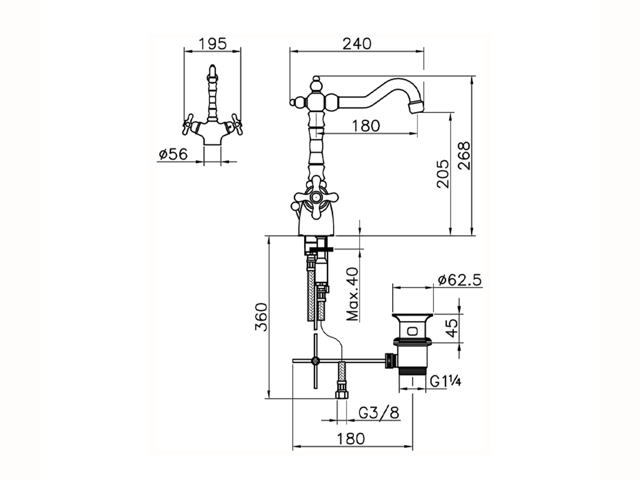 Lavabo termostático,con desagüe automático 1"1/4,caño giratorio,latiguillos acero G.3/8"